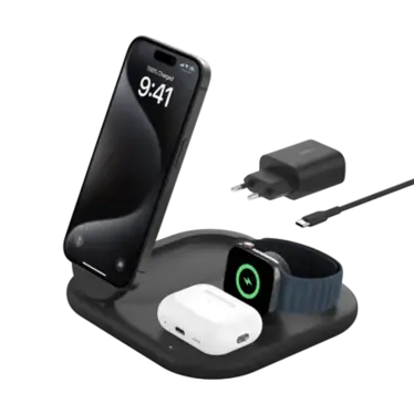 Rechargez simultanément votre iPhone, vos AirPods et votre Apple Watch avec un design élégant, compact et certifié – désormais disponible en noir.